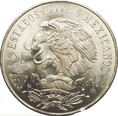 另一枚耗銀最多的紀念幣就是產銀大國墨西哥出品的,約發行了2700萬枚,據估算,制造這枚紀念幣就耗費掉了近440.3噸純銀。1968年,墨西哥城舉辦了第19屆奧運會。這枚銀幣面值25比索,幣徑38mm,重量22.5g,含銀量72%。此幣正面圖案有國名、帶有濃鬱墨西哥風情的棲息于仙人掌上的鷹蛇、面值、造幣廠印記“M”;背面圖案為墨西哥土著瑪雅人球賽,背景是工字形賽場。