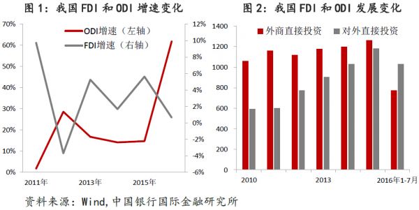 第一,今年我國有望成為資本凈輸出國。五年前,我國對外直接投資(ODI)僅為外商直接投資(FDI)的56%,是一個典型的資本凈輸入國。過去五年中,我國對外直接投資年均增速達到14.9%,顯著高于外商直接投資年均增速3.6%,投資輸入輸出金額逐漸接近。今年1-7月,我國對外直接投資出現了前所未有的高增速(61.8%),投資金額超過外商直接投資額256億美元。再考慮到若幹大型對外投資交易或于今年完成並納入統計,如中國化工430億美元收購先正達,我國到今年年底有較大概率對外直接投資額多于外商直接投資額,從資本凈輸入國變為凈輸出國。