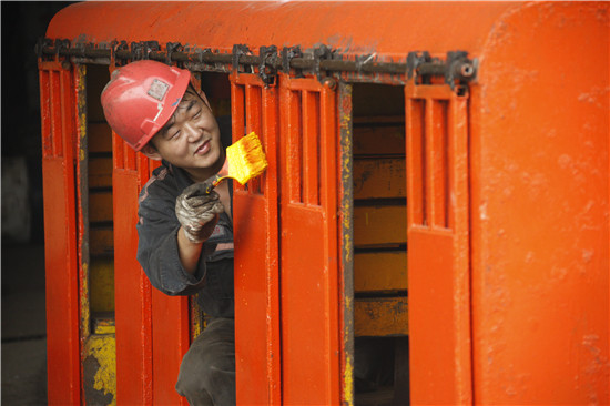 安徽省淮北市,一名機械設備制造企業的工人在油漆機械設備。視覺中國供圖(資料圖片)