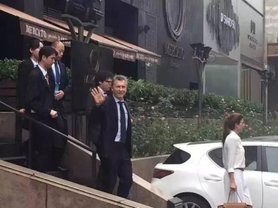 今天中午11點多,阿根廷總統馬克里及夫人,還有10多人隨行人員,到達杭州大座D座莫卡多意大利餐廳就餐。在此之前一兩個小時,他的工作人員已提前來餐廳看過環境,並拿走了菜單。