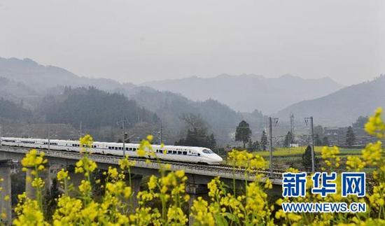 2015年1月20日,一列貴廣高鐵動車經過貴州省榕江縣境內的一片盛開的油菜花。 新華社發(王炳真 攝)