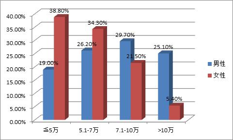 根據調查,女性勞動力的個人年收入在“5萬元及以下”和“5.1萬-7萬”的分別佔38.80%和34.20%,而男性勞動力的對應百分比僅分別為19.00%和26.20%。但是,男性勞動力的個人年收入在“7.1萬-10萬”和“10萬元以上”的佔比分別達到29.70%和25.10%,而女性的對應比例則分別只有21.50%和5.40%。