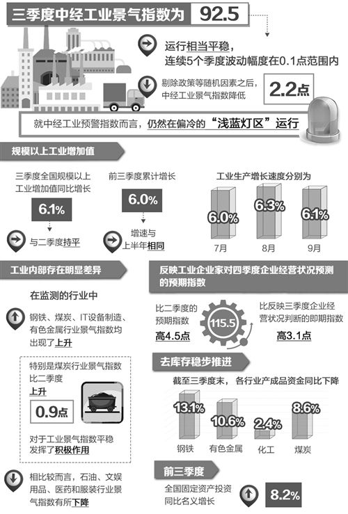 由經濟日報社中國經濟趨勢研究院、國家統計局中國經濟景氣監測中心、中國社科院數量經濟與技術經濟研究所共同編制的2016年三季度中經產業景氣指數30日發布。中經產業景氣指數所採集的行業涵蓋了工業領域的重點產業,包括裝備制造、煤炭、石油、電力、鋼鐵、有色金屬、化工、IT設備制造、醫藥、服裝、文體娛樂用品等。本期報告重點分析今年三季度上述行業的運行情況和特點,並對今年四季度和明年一季度的發展趨勢進行預測——