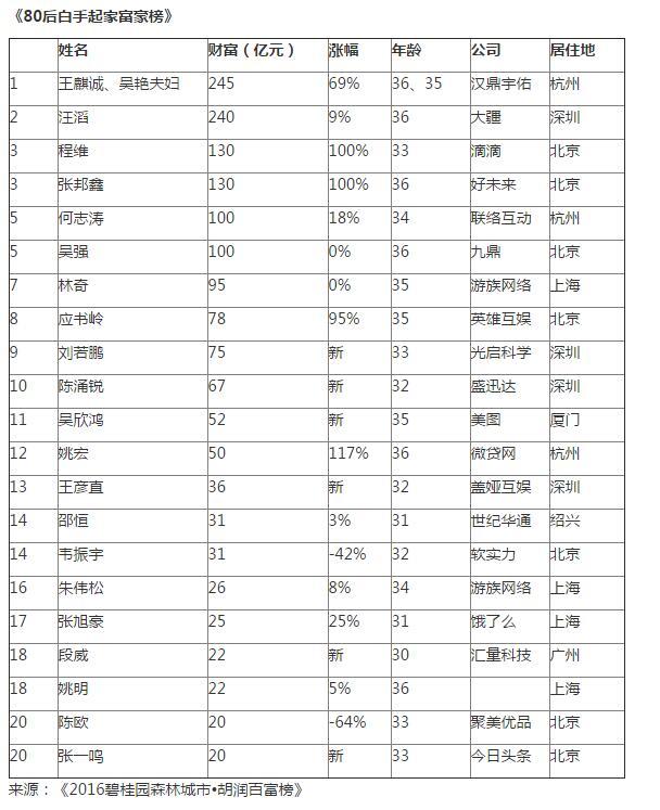 《80後白手起家富豪榜》部分,漢鼎宇佑王麒誠、吳艷夫婦以245億成為最富有的80後白手起家富豪,“無人機大王”大疆汪滔財富240億元,排名第二;滴滴程維和好未來張邦鑫分別財富130億元並列第三。
