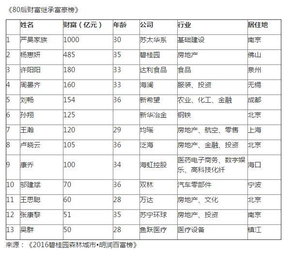 以下為《80後財富繼承富豪榜》前13名榜單: