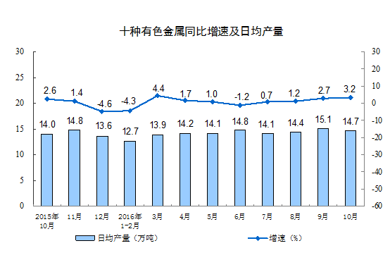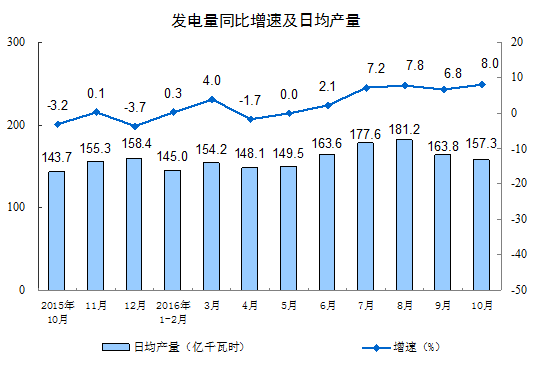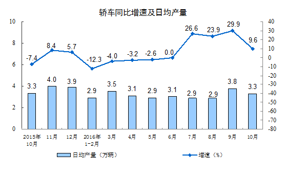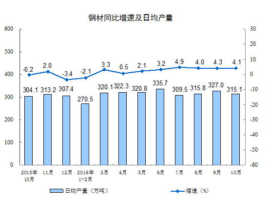分產品看, 10 月份,統計的 589 種主要產品中有 377 種產品同比增長。其中,鋼材 9768 萬噸,同比增長 4.1% ;水泥 22783 萬噸,增長 3.0% ;十種有色金屬 455 萬噸,增長 3.2% ;乙烯 147 萬噸,下降 6.3% ;汽車 240.9 萬輛,增長 18.0% ;轎車 102.7 萬輛,增長 9.6% ;發電量 4876 億千瓦時,增長 8.0% ;原油加工量 4705 萬噸,增長 5.5% 。