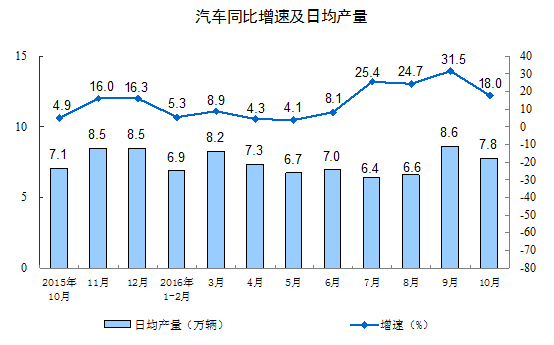 分行業看, 10 月份, 41 個大類行業中有 35 個行業增加值保持同比增長。其中,農副食品加工業增長 6.5% ,紡織業增長 4.8% ,化學原料和化學制品制造業增長 6.7% ,非金屬礦物制品業增長 5.9% ,黑色金屬冶煉和壓延加工業下降 3.3% ,有色金屬冶煉和壓延加工業增長 3.4% ,通用設備制造業增長 8.2% ,專用設備制造業增長 8.3% ,汽車制造業增長 17.9% ,鐵路、船舶、航空航天和其他運輸設備制造業增長 2.4% ,電氣機械和器材制造業增長 8.3% ,計算機、通信和其他電子設備制造業增長 9.3% ,電力、熱力生產和供應業增長 7.5% 。