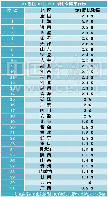 中國經濟網記者統計匯總了10月份31省區的CPI漲幅情況,10月全國CPI同比上漲2.1%,其中10省區CPI同比漲幅超全國水平。由漲幅高低排序,依次為上海、海南、西藏、江蘇、天津、山東、寧夏、吉林、湖北、江西。