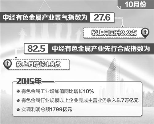 由中國有色金屬工業協會、經濟日報社中國經濟趨勢研究院、國家統計局中國經濟景氣監測中心聯合編制的2016年10月份中經有色金屬產業月度景氣指數報告近日發布。報告顯示,10月份中經有色金屬產業景氣指數為27.6,較上月回升2.2點,上升至“偏冷”區域上沿,且三季度以來同比增幅逐月擴大,行業整體出現了積極向好的趨勢。