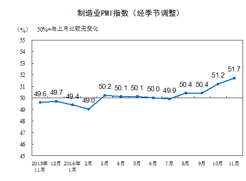 中國經濟網北京12月1日訊 據國家統計局網站消息,2016 年 11 月份,中國制造業採購經理指數( PMI )為 51.7% ,比上月上升 0.5 個百分點,延續上行走勢。