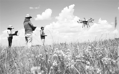 在呼倫貝爾農墾集團謝爾塔拉農場的天然草地恢復技術示范區,三名來自中國科學院的科研人員正在用無人機監測草場恢復情況。 新華社記者 金立旺攝