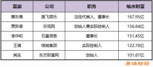 2016年,A股市場有五個富豪身家縮水超百億,分別是奧飛娛樂董事長蔡東青、樂視網實際控制人賈躍亭、石基信息董事長李仲初、信威集團實際控制人王靖以及東方財富網創始人其實。