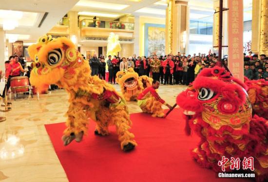 1月28日,遼寧沈陽,市民在觀看舞獅表演。當日,是中國農歷大年初一,在沈陽一酒店內上演舞獅表演鬧新春。中新社記者 于海洋 攝