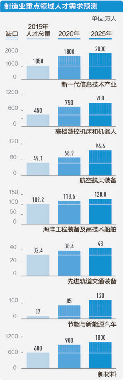根據《指南》,到2020年,我國將形成與制造業發展需求相適應的人力資源建設格局,培養和造就一支數量充足、結構合理、素質優良、充滿活力的制造業人才隊伍,基本確立建設制造強國的人才優勢,為實現中國制造“三步走”戰略目標奠定堅實的人才基礎。