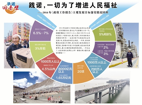2016年《政府工作報告》提出經濟社會發展的一係列預期目標:國內生產總值增長6.5%—7%,城鎮新增就業1000萬人以上,完成1000萬以上農村貧困人口脫貧任務,城鄉低保人均補助標準分別提高5%和8%……這些目標不僅是經濟社會的發展方向,更是政府的民生承諾。一年來,面對紛繁復雜的國內外形勢,我們堅持以新發展理念引領發展,堅持穩中求進工作總基調,適應經濟發展新常態,著力加強供給側結構性改革。一年過去了,這些承諾完成得怎麼樣?請看對部分量化指標的解讀——