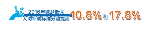 2016年,我國城市和農村低保(簡稱城鄉低保)平均標準分別同比提高10.8%和17.8%,超額完成了年初制定的城鄉低保人均補助標準分別提高5%和8%的目標任務。