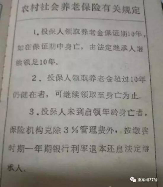 瀏陽市民政局辦公室李主任告訴重案組37號(微信ID:zhonganzu37),徐小喬在20年前辦理的農村社會養老保險是俗稱的“老農保”,是根據民政部1992年下發的《縣級農村社會養老保險基本方案》推廣實施的。方案規定,農村社會養老保險基金籌集以個人繳費為主、集體補貼為輔,實行個人賬戶儲備積累制,農民個人繳納的保險費和集體對其補助全部記在個人名下。