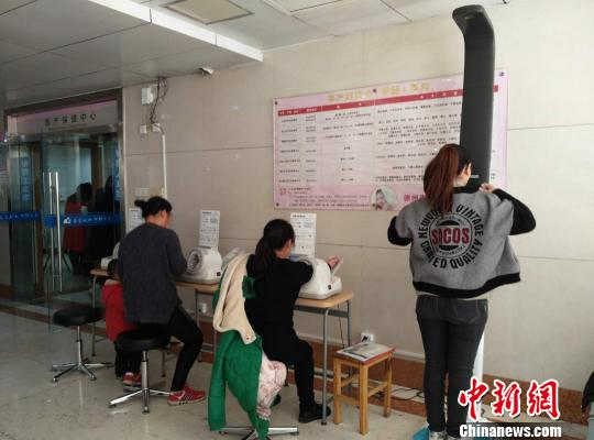 在徐州市婦幼保健醫院候診區,孕產婦們正在自助測量血壓、身高和體重。 朱志庚 攝