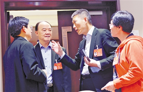 3月13日上午,人大山東代表團在駐地舉行分組會議,審議兩高報告。審議結束後,全國人大代表周洪江(右二)與同團代表交流時認為,轉型升級是國有企業深化改革的出路所在。 經濟日報記者 李景錄攝