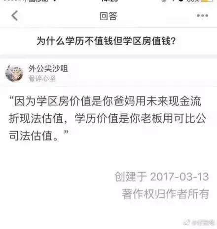 @侯安揚HF:為什麼學歷不值錢,學區房值錢?因為前者是兌現的業績,沒想象空間;後者是概念,可以炒啊