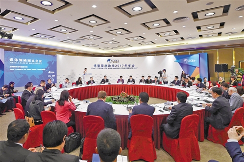 3月23日,博鰲亞洲論壇“媒體領袖圓桌會議”在海南博鰲召開,來自“一帶一路”沿線10多個國家的20余位媒體領袖匯聚一堂,圍繞“亞洲媒體合作新未來”的主議題,共同探討在新形勢下加強和深化“一帶一路”框架下的媒體合作。 新華社記者 楊冠宇攝