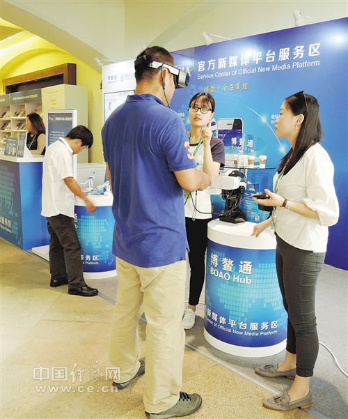 在博鰲官方新媒體平臺服務區,與會嘉賓在體驗VR直播。經濟日報記者 朱 琳攝