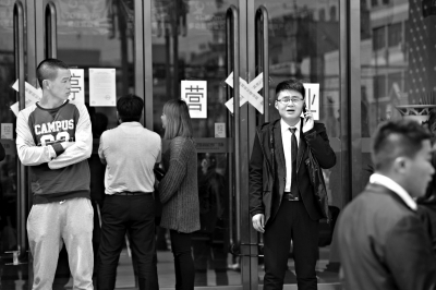 部分購房者和中介人員仍徘徊在售樓處門前。 本報記者 和冠欣攝