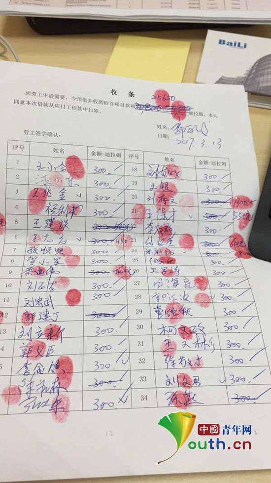 中建中東公司給工人的300迪拉姆生活費,圖為收條。