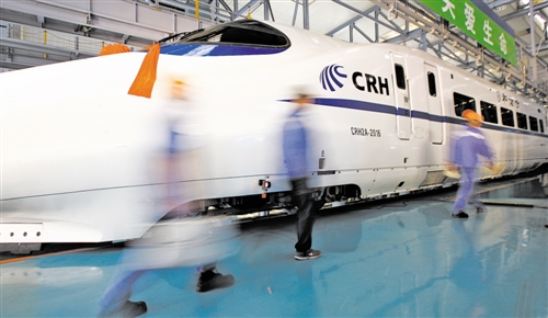 4月17日,在上海南動車運用所檢修車間,幾名檢修人員走過一列動車組列車。 新華社記者 方 喆攝