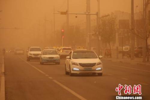 5月4日,內蒙古地區迎來今年最強沙塵暴,圖為車輛在沙塵中緩慢行駛。李愛平 攝