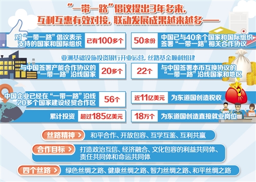 3年多的實踐成果,印證著中國倡議的魅力。目前,已有100多個國家和國際組織表達了對“一帶一路”倡議的支持,中國已與40余個國家和國際組織簽署50余份“一帶一路”相關合作協議,與哈薩克斯坦、捷克、老撾、柬埔寨等國簽署了“一帶一路”框架下的雙邊合作規劃綱要,並與蒙古、俄羅斯簽署了“一帶一路”框架下的國際經濟合作走廊建設規劃綱要。