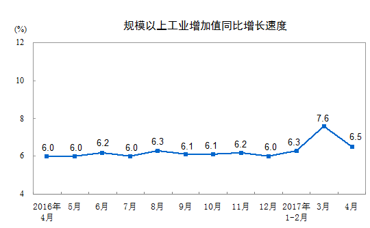 2017年4月份,規模以上工業增加值同比實際增長6.5%(以下增加值增速均為扣除價格因素的實際增長率),比3月份放緩1.1個百分點。這里有4月份因“五一”小長假提前而實際工作日比上年同期少一天的因素影響。經季節調整後,4月份規模以上工業增加值環比增長0.56%。1-4月份,規模以上工業增加值同比增長6.7%。