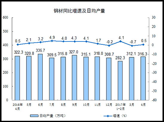 分產品看,4月份,596種產品中有419種產品同比增長。其中,鋼材9490萬噸,同比增長0.5%;水泥22113萬噸,增長 2.4%;十種有色金屬451萬噸,增長5.0%;乙烯150萬噸,增長1.1%;汽車220.9萬輛,增長0.3%;轎車86.0萬輛,下降8.3%;發電量4767億千瓦時,增長5.4%;原油加工量4445萬噸,下降0.6%。
