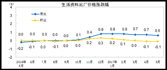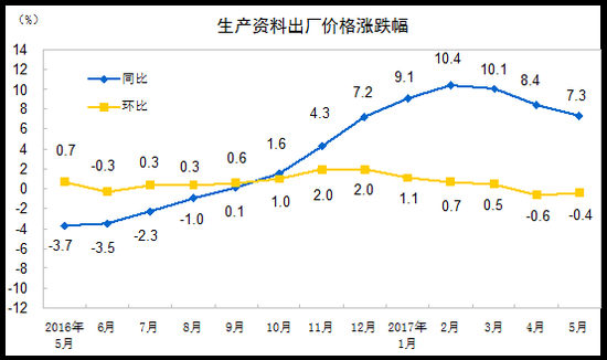 2017年5月份,全國工業生產者出廠價格同比上漲5.5%,環比下降0.3%。工業生產者購進價格同比上漲8.0%,環比下降0.3%。1-5月份平均,工業生產者出廠價格同比上漲6.8%,工業生產者購進價格同比上漲9.0%。