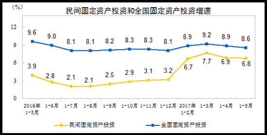 2017年1-5月份,民間固定資產投資124329億元,同比名義增長6.8%,增速比1-4月份回落0.1個百分點。民間固定資產投資佔全國固定資產投資(不含農戶)的比重為61%,與1-4月份持平。