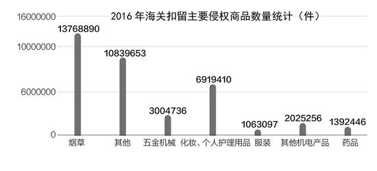 海關總署的數據顯示,海關近年來在進口環節查處的侵權案件以年均10%的速率持續增長。2016年,全國海關共查扣涉嫌侵犯自主知識產權貨物757.85萬余件,同比增長13.2%。
