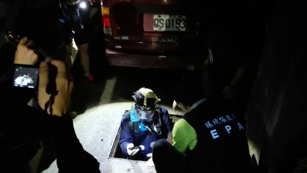 臺當局“環保署”人員穿戴防毒面罩鑽進彌漫高濃度硫化氫的排水溝內採樣。(圖片來源:臺灣東森新聞雲)