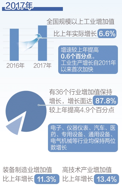 2017年,全國規模以上工業增加值比上年實際增長6.6%,增速較上年提高0.6個百分點。工業生產增長自2011年以來首次加快。