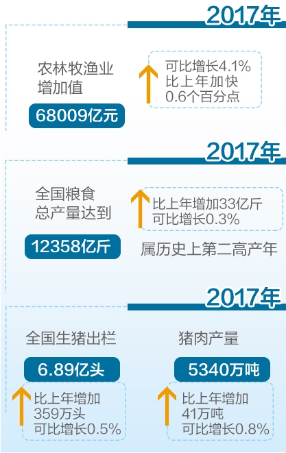 2017年各地區各部門牢固樹立並積極踐行新發展理念,深入貫徹落實中央“三農”工作各項決策部署,堅持穩中求進工作總基調,以推進農業供給側結構性改革為主線,圍繞農業增效、農村增綠、農民增收,加快結構調整,推進提質增效,轉變農業發展方式,積極推動農業由追求數量增長向高質量發展轉變,現代農業建設穩步推進,糧食生產再獲豐收,大宗農產品供給充裕,市場運行平穩,為順利完成全年各項發展目標和社會大局穩定奠定了堅實的基礎、提供了強有力支撐。
