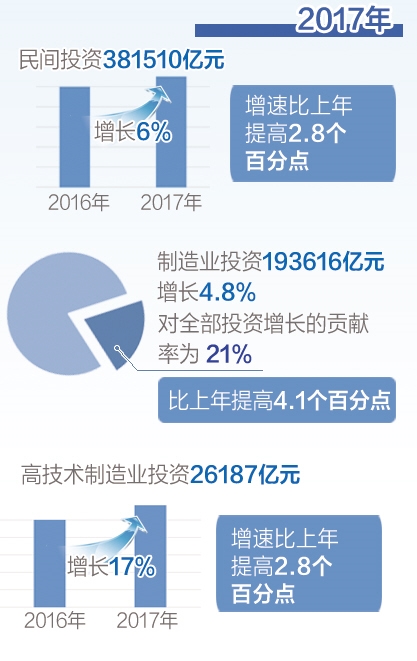 2017年,中央促進民間投資穩定增長的各項政策措施效果顯現,民間投資整體回暖向好,自3月份起各月增速均比上年同期有不同程度提高,與全部投資增速之間的差距逐步縮小。2017年,民間投資381510億元,增長6%,增速比1月份至11月份提高0.3個百分點。