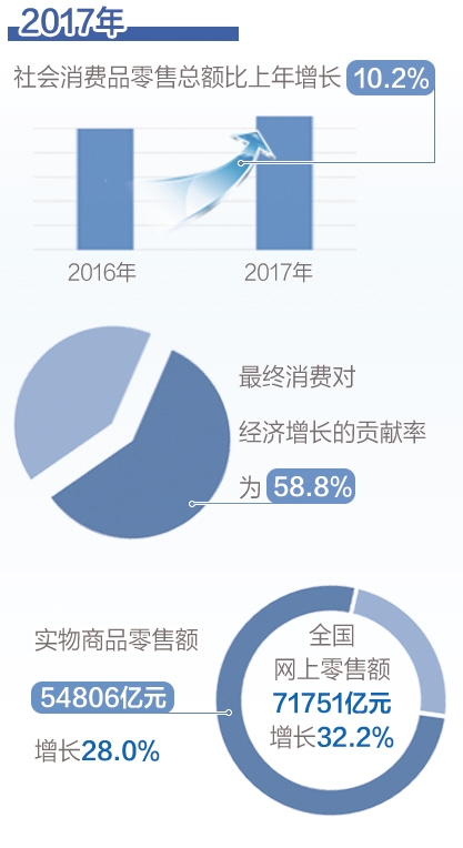 2017年,我國居民收入增長加快,消費轉型升級態勢明顯,消費品市場規模進一步擴大,新興業態和新商業模式快速發展,消費品市場業態結構、商品結構、城鄉結構持續優化,消費繼續發揮經濟增長主要驅動力的作用。