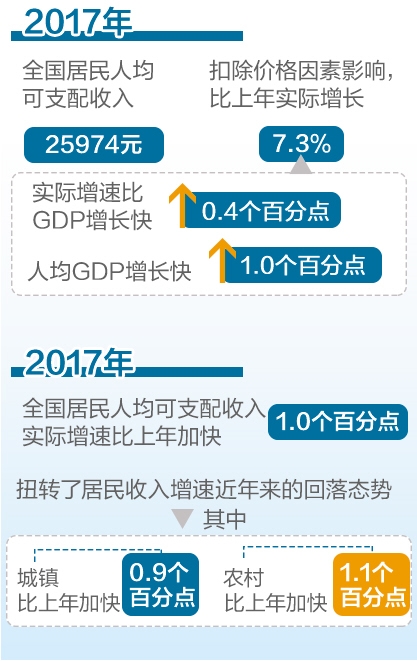 居民收入增長快于經濟增長。2017年,全國居民人均可支配收入25974元,扣除價格因素影響,比上年實際增長7.3%,實際增速比GDP和人均GDP增長分別快0.4和1.0個百分點。