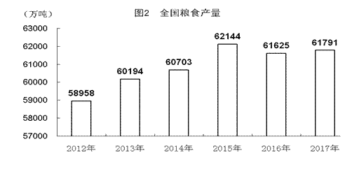 全年全國糧食總產量61791萬噸,比上年增加166萬噸,增長0.3%。其中,夏糧產量14031萬噸,增長0.8%;早稻產量3174萬噸,下降3.2%;秋糧產量44585萬噸,增長0.4%。棉花產量549萬噸,增長2.7%。全年豬牛羊禽肉產量8431萬噸,比上年增長0.8%。其中,豬肉產量5340萬噸,增長0.8%;牛肉產量726萬噸,增長1.3%;羊肉產量468萬噸,增長1.8%;禽肉產量1897萬噸,增長0.5%。生豬存欄43325萬頭,比上年下降0.4%;生豬出欄68861萬頭,增長0.5%。
