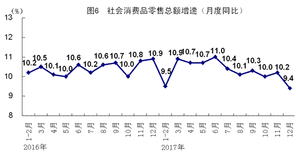 全年社會消費品零售總額366262億元,比上年增長10.2%,增速比上年回落0.2個百分點。其中,限額以上單位消費品零售額160613億元,增長8.1%。按經營單位所在地分,城鎮消費品零售額314290億元,增長10.0%;鄉村消費品零售額51972億元,增長11.8%。按消費類型分,餐飲收入39644億元,增長10.7%;商品零售326618億元,增長10.2%,其中限額以上單位商品零售150861億元,增長8.2%。消費升級類商品較快增長,通訊器材、體育娛樂用品及化妝品類商品分別增長11.7%、15.6%和13.5%。12月份,社會消費品零售總額同比增長9.4%,環比增長0.7%。