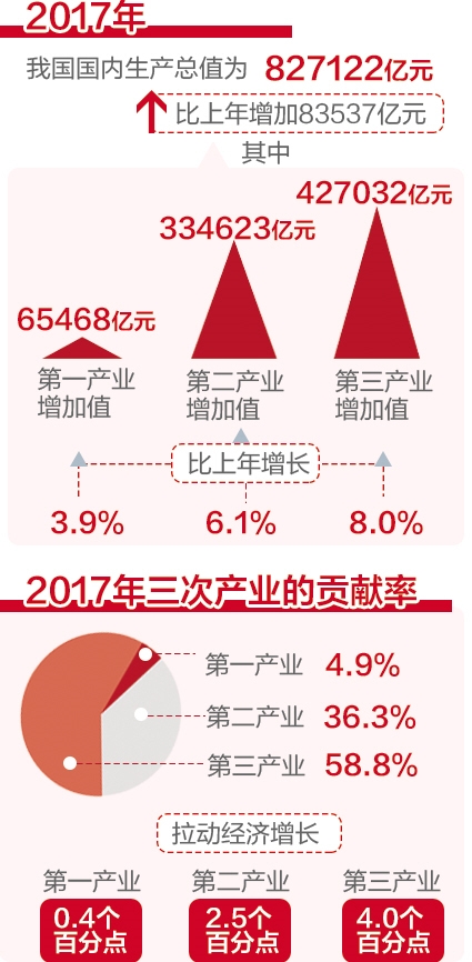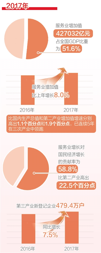 2017年,服務業增加值427032億元,佔全國GDP比重為51.6%;服務業增加值比上年增長8.0%,比國內生產總值和第二產業增加值增速分別高出1.1個百分點和1.9個百分點,已連續5年在三次產業中領跑;服務業增長對國民經濟增長的貢獻率為58.8%,比第二產業高出22.5個百分點;拉動全國GDP增長4.0個百分點,比第二產業高出1.5個百分點。