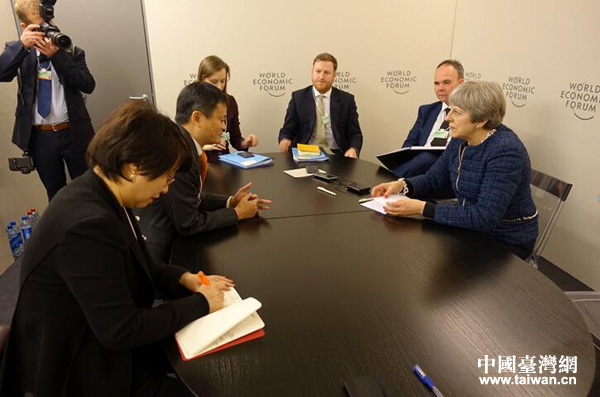 達沃斯時間25日,馬雲同英國首相特蕾莎梅見面,就新型全球化、中小企業發展等議題交流。(中國臺灣網發 阿里巴巴供圖 )