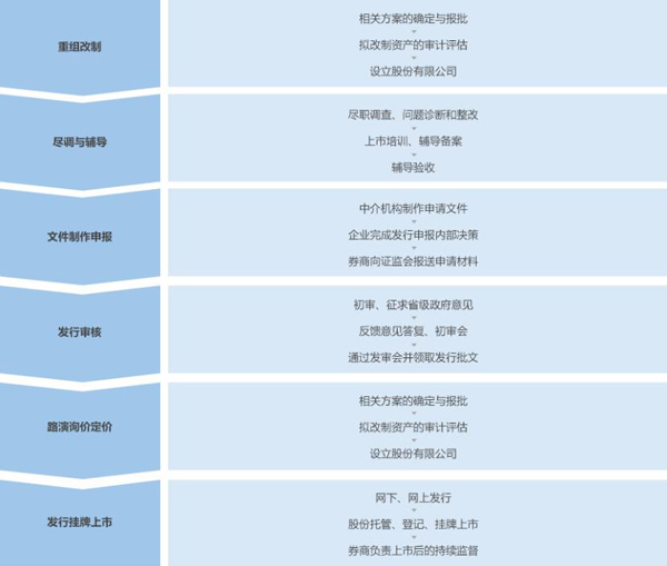 證監會設立發行審核委員會,依法審核股票發行事宜。根據證監會發行監管部公布的《首次公開發行股票審核工作流程》,分為如下階段:受理及預先披露、回饋會、見面會、預先披露更新、初審會、發審會、封卷、會後事項、核準發行九個步驟。