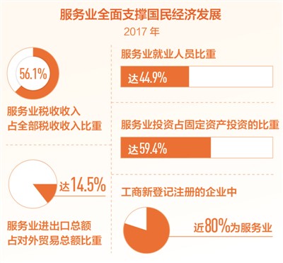 服務業已成為稅收的主要來源。2017年,服務業稅收收入佔全部稅收收入比重為56.1%,比上年增長9.9%,連續5年對稅收收入貢獻過半。
