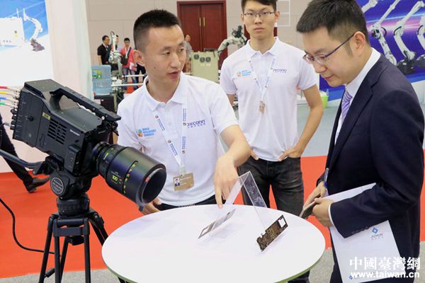 富士康工作人員向與會嘉賓介紹展臺情況。(中國臺灣網 張亞靜 攝)
