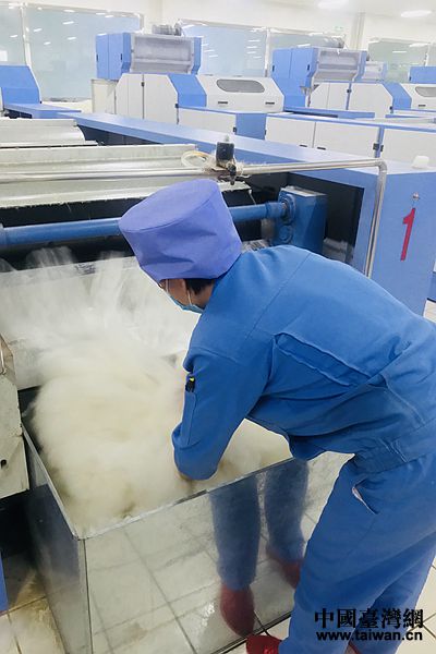2018年8月13日,寧夏同心縣扶貧產業園的伊興羊絨車間,一名女工正在整理羊絨。(中國臺灣網 黃曉迪 攝)